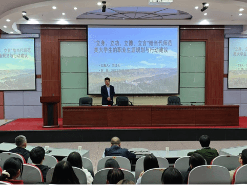 贺过长以《“立身、立功、立德、立言”——当代师范生的职业生涯规划与行动建议》为题,分享了自己扎根基层教育的奋斗历程。他围绕当前师范生就业现状,结合大学生就业案例,提出“谋生立命—谋事立功—终身成长”的阶梯式成长路径,鼓励学弟学妹善用考研深造、国家基层项目、企业入职、参军报国、自助创业等“五大通道”立身,通过终身学习与自我认知明确定位行动方向,在实践中锤炼责任担当与吃苦品质,为职业发展打下坚实基础。
