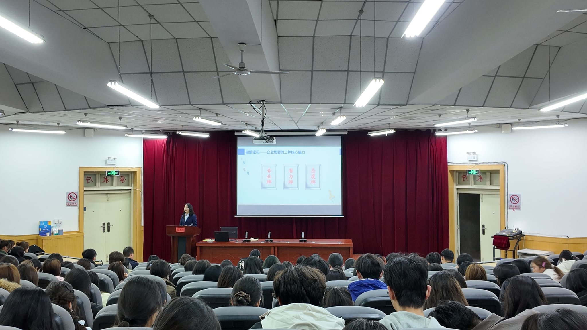 10月26日晚,太阳成集团tyc122cc邀请青海互助天佑德青稞酒股份有限公司人力资源部经理包正梅来校,为200余名师生作题为《毕业不迷茫!天佑德教你如何把“专业”变成“硬核饭碗”》的专题讲座。